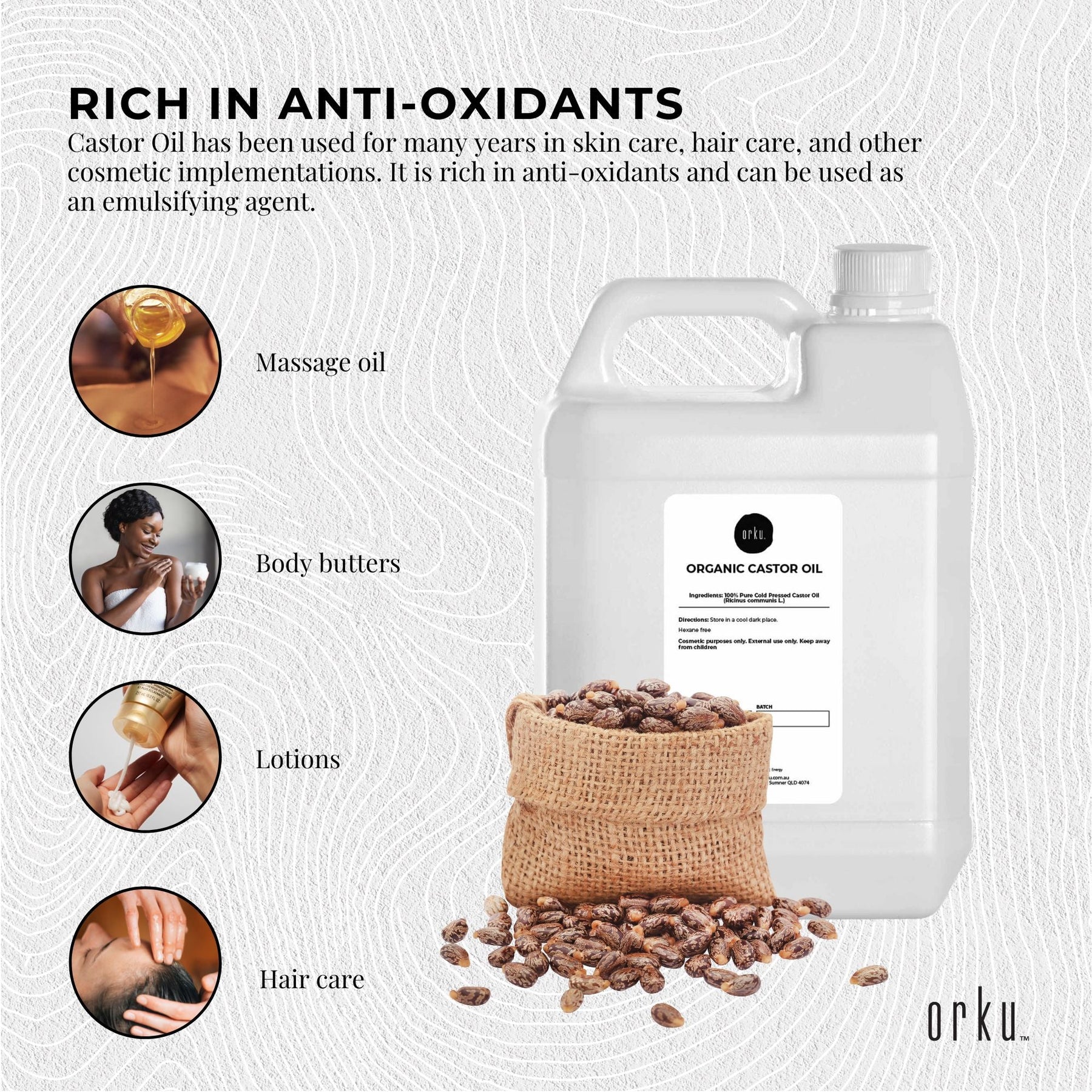 Organic Castor oil, which can also be known as a carrier or massage oil, has been used for many years in skin care, hair care, and other cosmetic implementations. It is rich in anti-oxidants and can be used as an emulsifying agent.