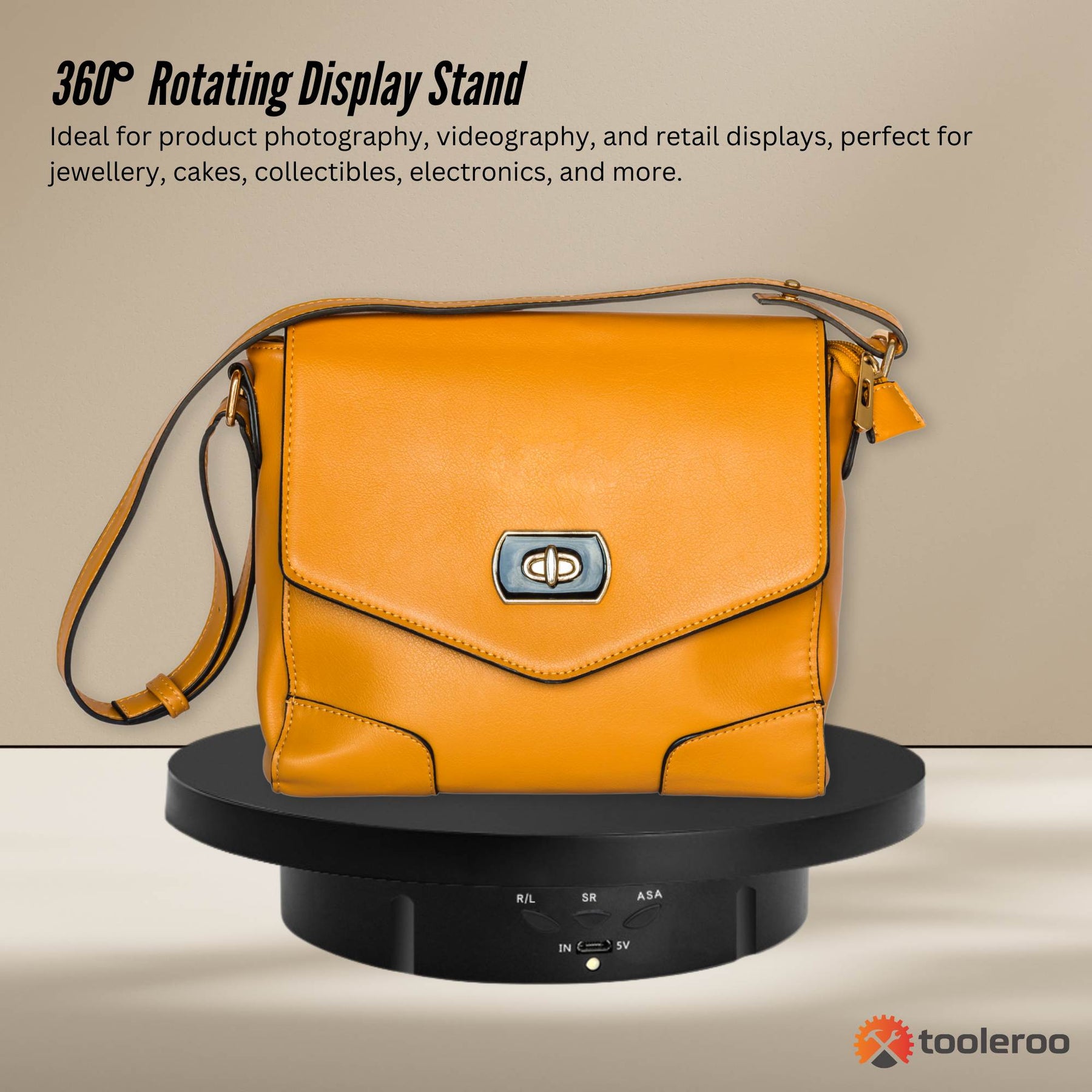 360° Rotating Display Stand – Ideal for product photography, videography, and retail displays, this electric turntable ensures smooth and quiet rotation, perfect for jewellery, cakes, collectibles, electronics, and more.